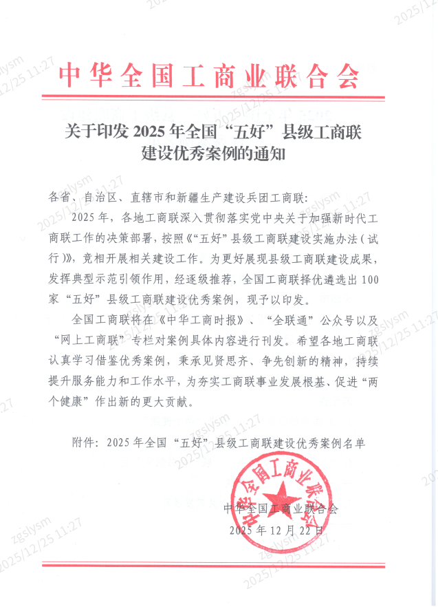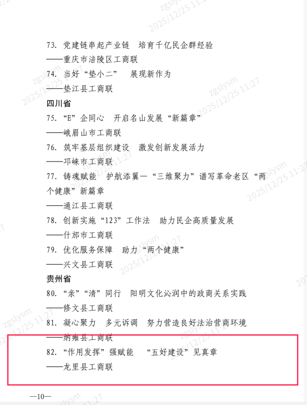 近日,中华全国工商业联合会公布2025年全国“五好”县级工商联建设优秀案例名单,黔南州龙里县工商联《“作用发挥”强赋能 “五好建设”见真章》”案例成功入选,成为全省3个入选全国100个优秀县级工商联案例之一,展现了黔南州工商联在服务基层组织建设助力“两个健康”工作中的创新成果与示范作用。